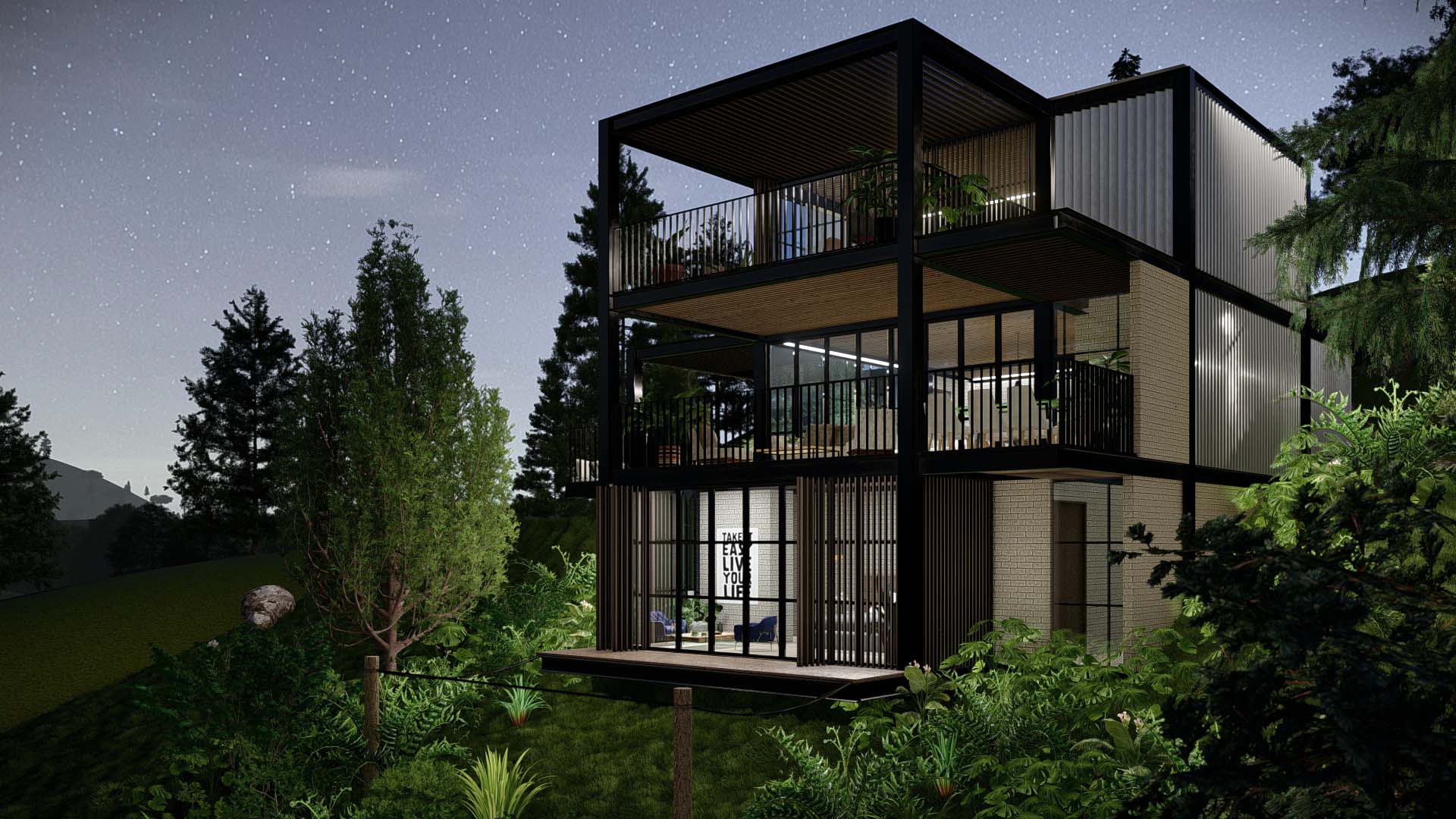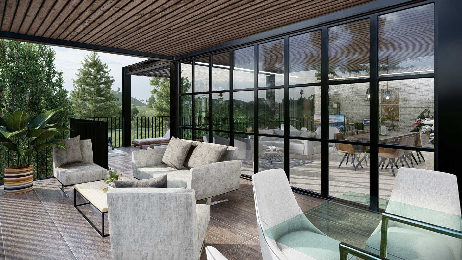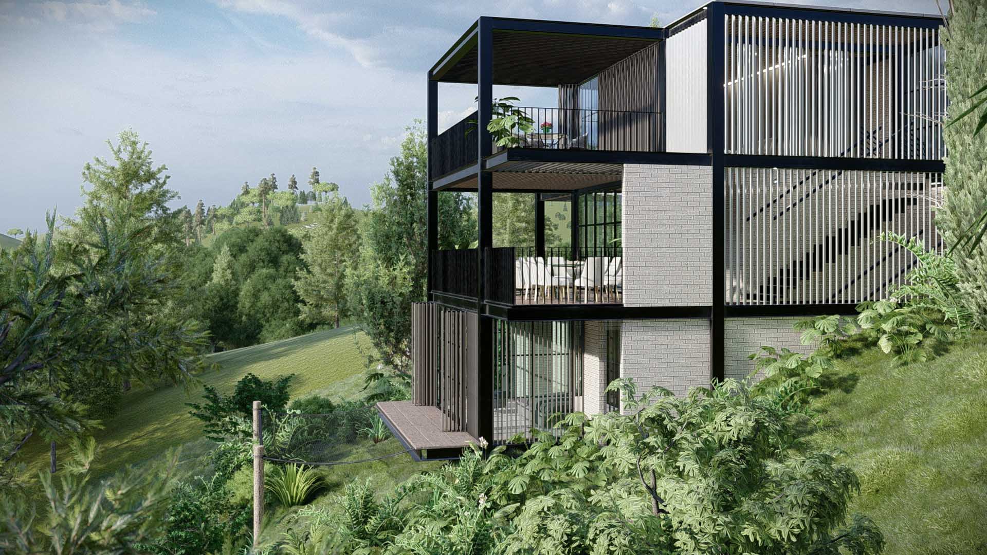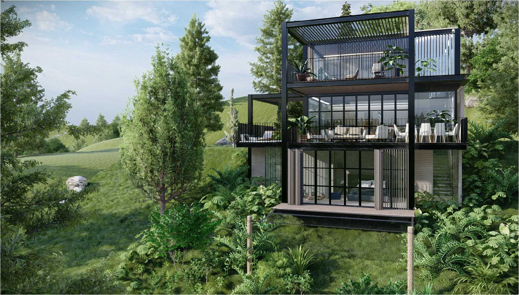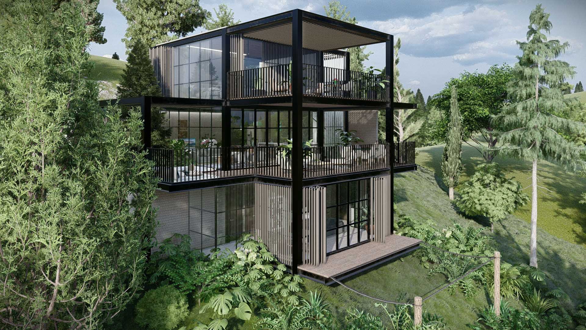 Diseñada por el arquitecto Juan Carlos Upegui, y visualizada por StudioBIM, esta casa de 191.84 m² se construye en ladrillo natural y estructura metálica. Consta de tres habitaciones, amplios ventanales que enmarcan el entorno y un dinámico juego de volúmenes donde se insertan jardines escalonados que acompañan la pendiente. Estos jardines no solo enriquecen el recorrido interior, sino que generan espacios íntimos y frescos que conectan lo natural con lo construido, logrando una vivienda armoniosa y adaptada a su entorno.