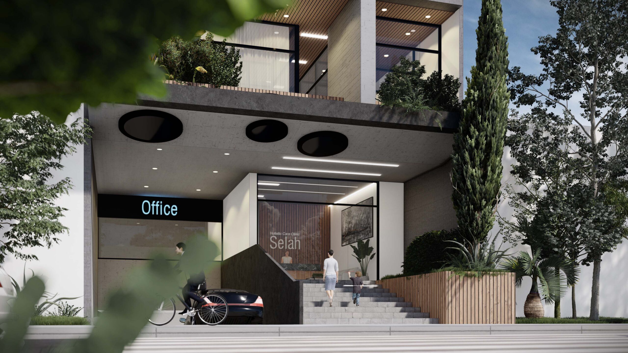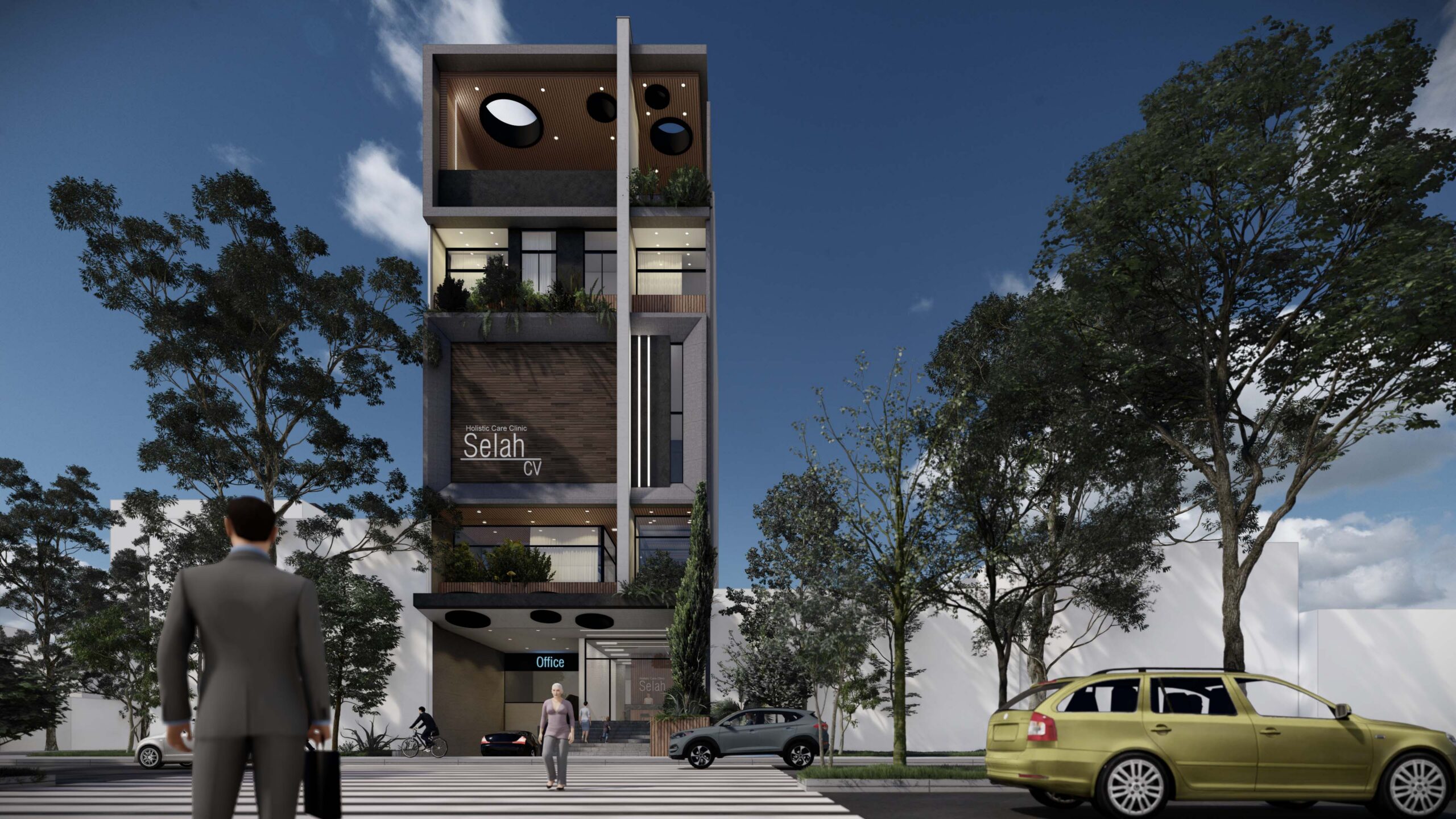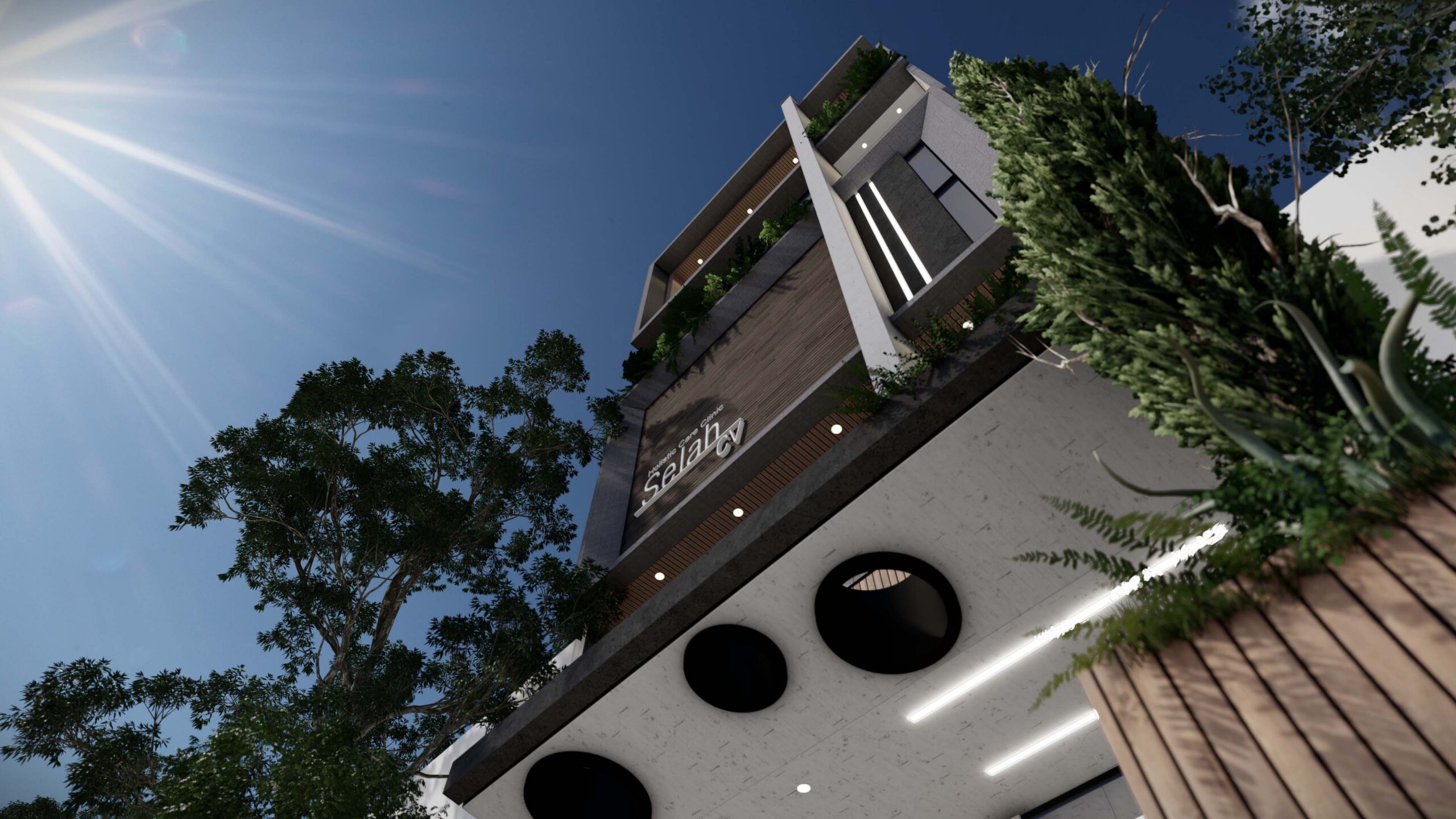 Este centro de cuidado integral combina diseño contemporáneo con criterios bioclimáticos, uso de materiales nobles, y sistemas sostenibles como recolección de aguas lluvias. Pensado como un espacio de desarrollo y sanación, cuenta con gimnasio, piscinas para hidroterapia, auditorios, cocinas, oficinas y apartamentos privados para individuos o familias. La fachada incorpora luces ambientales y cintas LED, reafirmando su carácter icónico y moderno. Selah no es solo un edificio: es un refugio, una pausa en medio del ritmo urbano, que redefine cómo debe sentirse un lugar de alojamiento espiritual y sanador.
